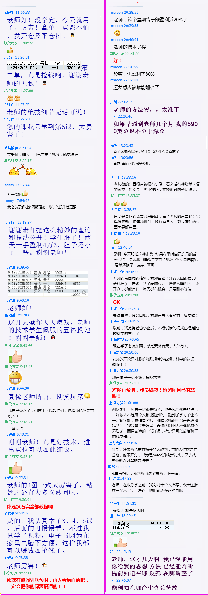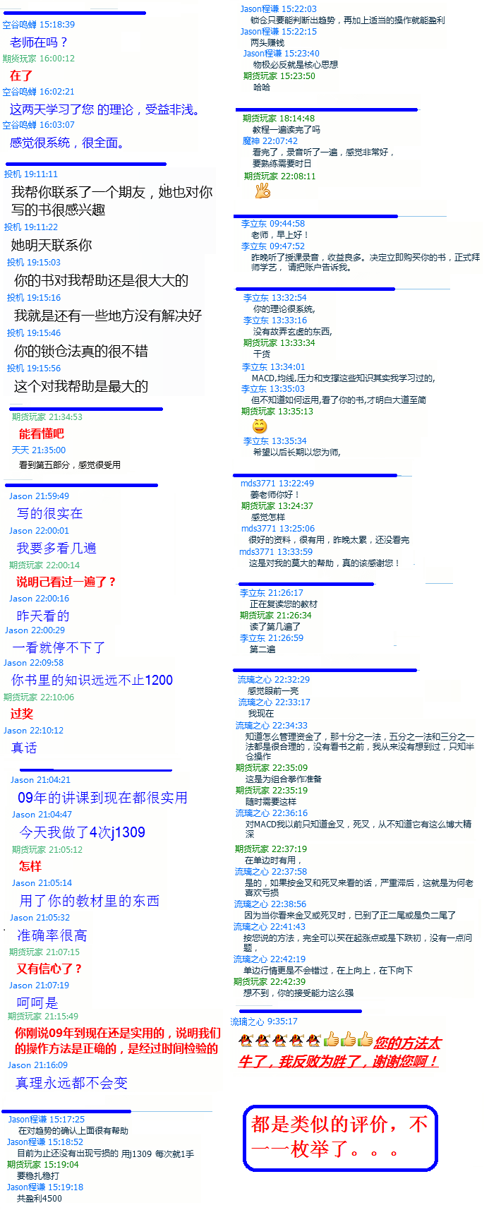 “真正的交易宝典!我也是个老期货玩家了,但是才让我看到什么是真实的好技术。。。一句话服了!想不到还有这么精深简单的好东西,就是在(再)卖贵点都名副属(其)实了。”